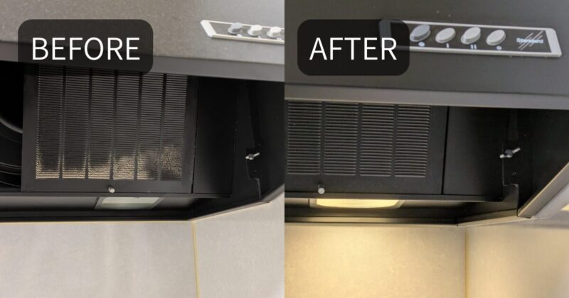 普段はレンジフードにフィルターを貼り付けてなるべくホコリが溜まらないように工夫しているものの、1年以上経過するとさすがに汚れが……