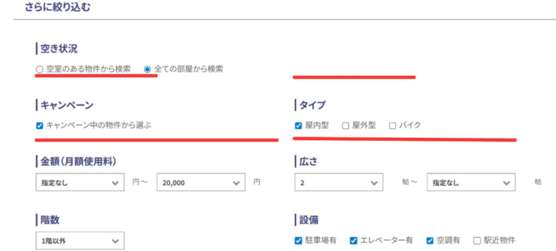 絞り込み機能を使用するとキャンペーンを含め、希望の予算と広さから候補の部屋を探すことが可能です。