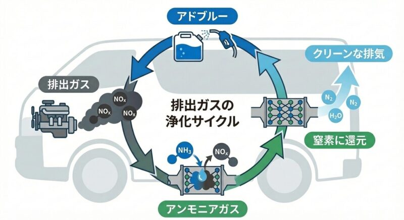 - アドブルー内の尿素がエンジンの排熱で加水分解されてアンモニアガスに
