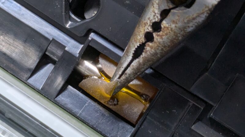カバーを開けて旧ローラーにアクセスすると、ゴムがぐにゃぐにゃに溶けていてまともに掴めない状態でした。
