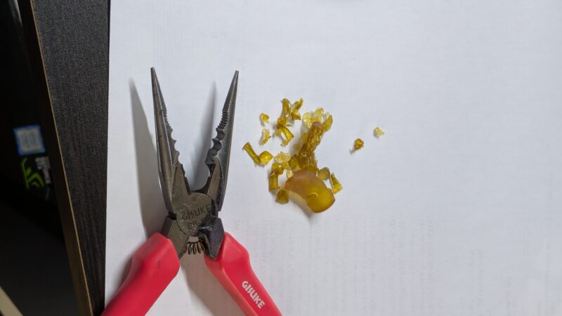 素手でやると指に加水分解したゴムがベタベタ付着して悲惨なことになるので、ラジオペンチとカッターを使って少しずつ剥がしていきました。