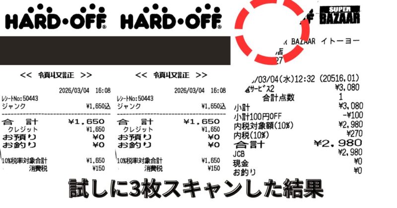 カバーを閉めて電源を入れ、手元にあったレシートでテストスキャン。