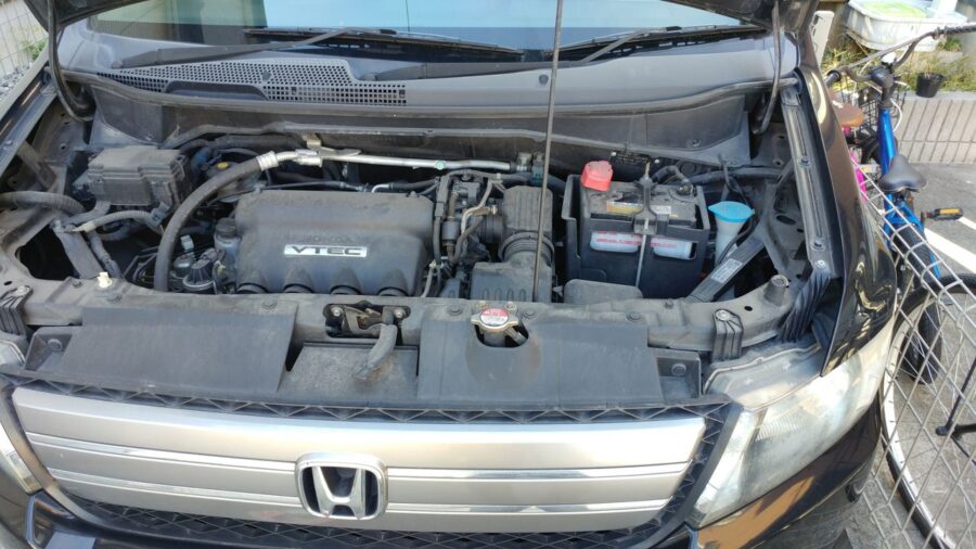 向かって右側(助手席側)にバッテリーが収まっていますので、この旧バッテリーを取り外していきます。